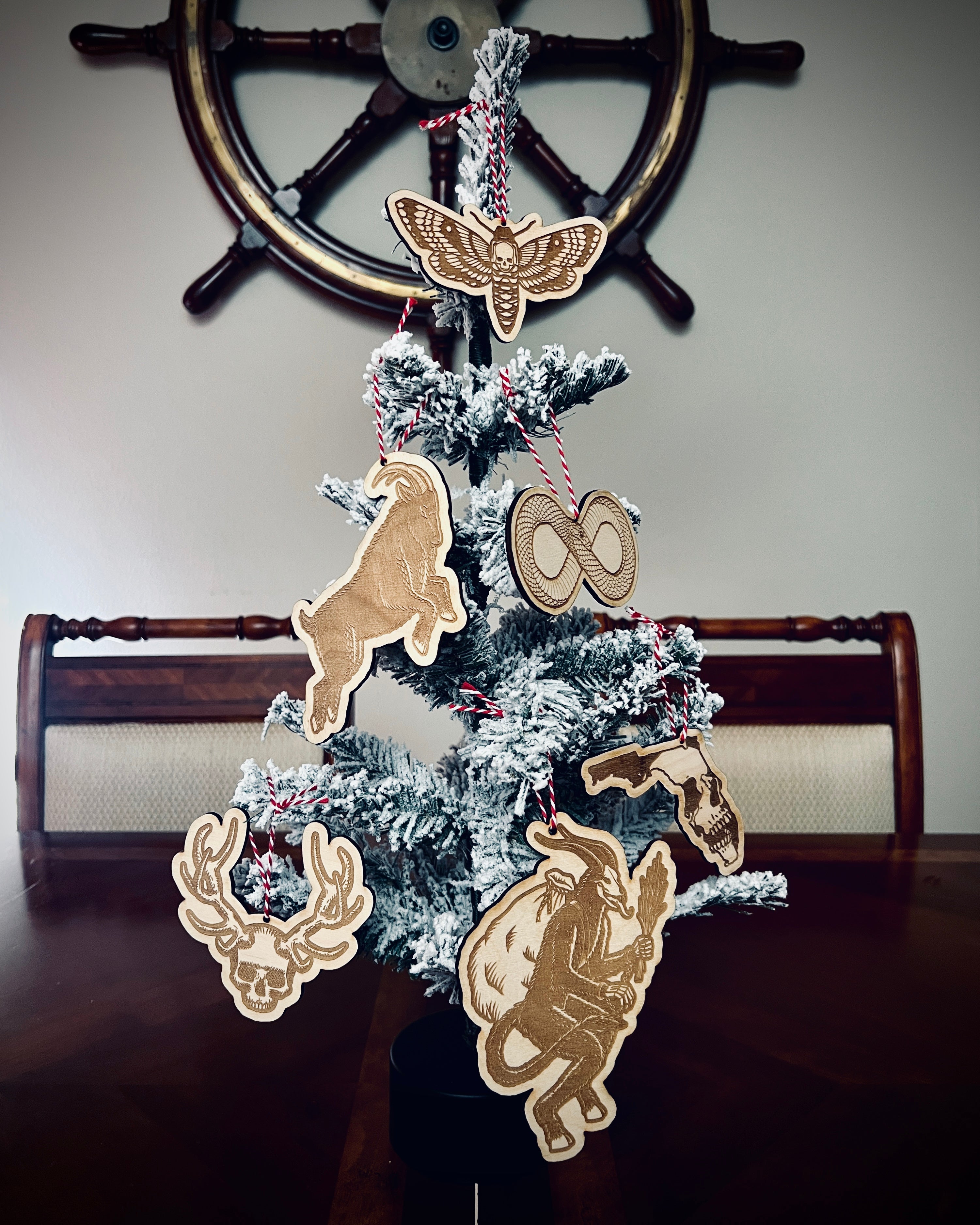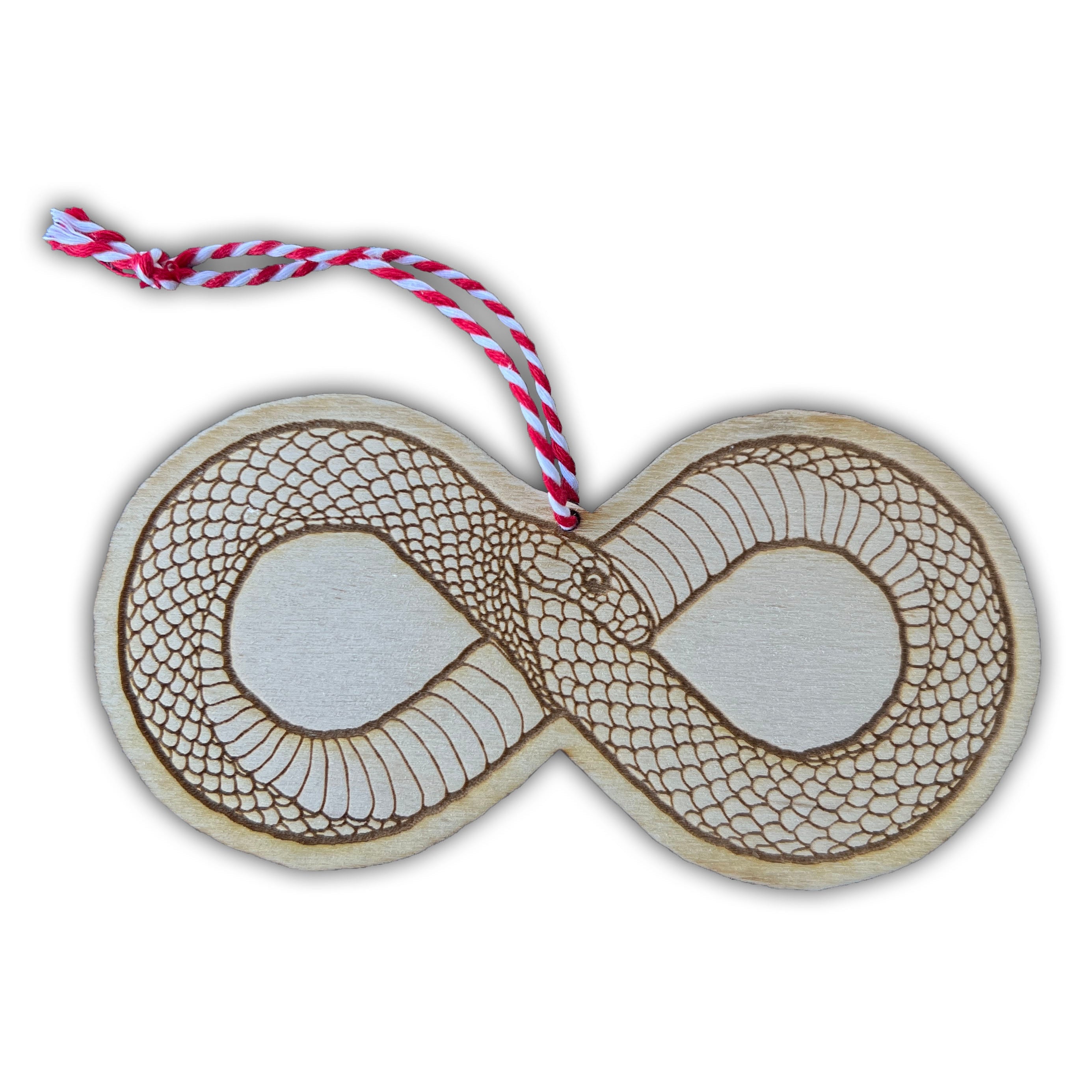 Laser engraved wood ornament with candy cane colored twine. 5”