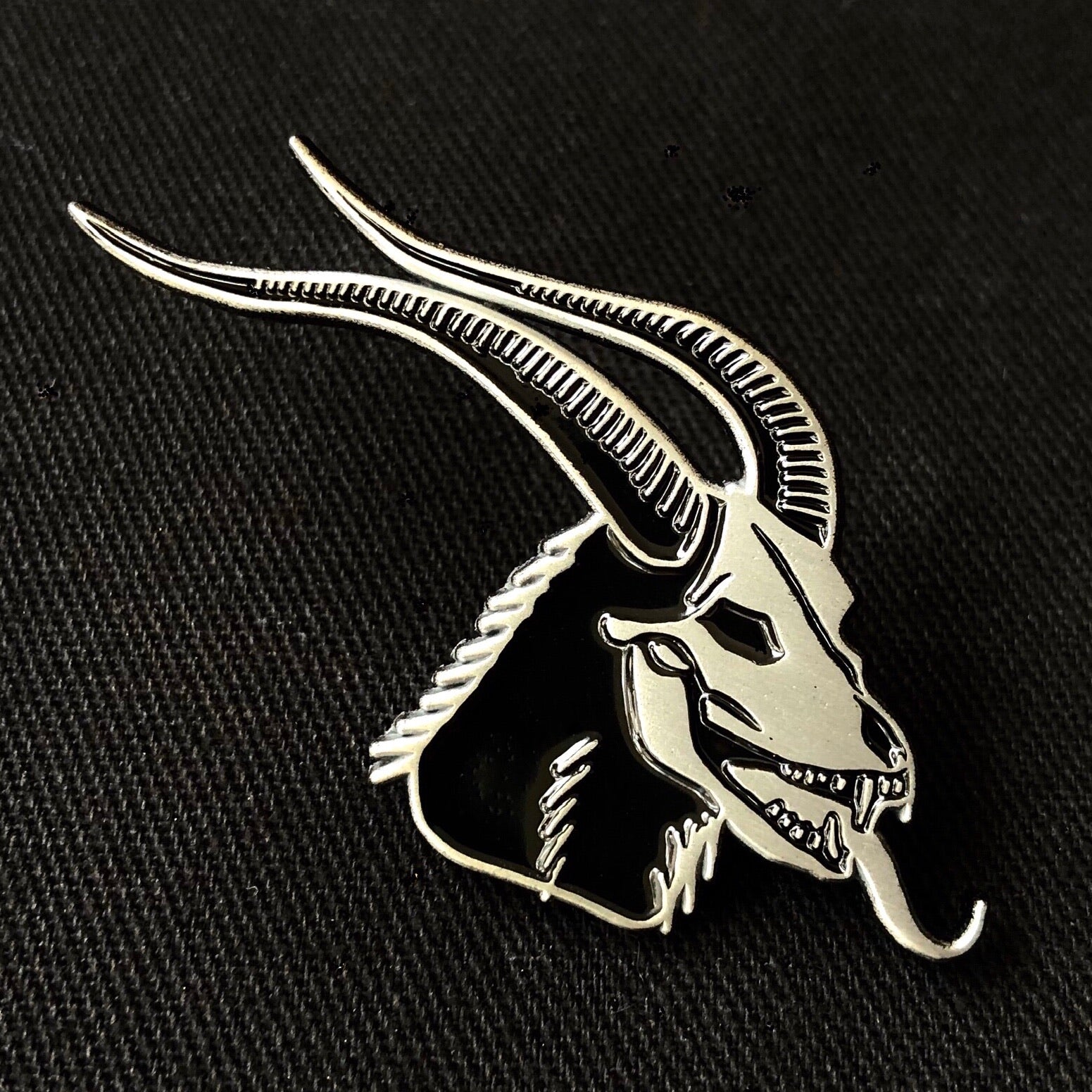 Soft enamel pin with antique silver plating, black enamel, and measuring 1 5/8 inches wide