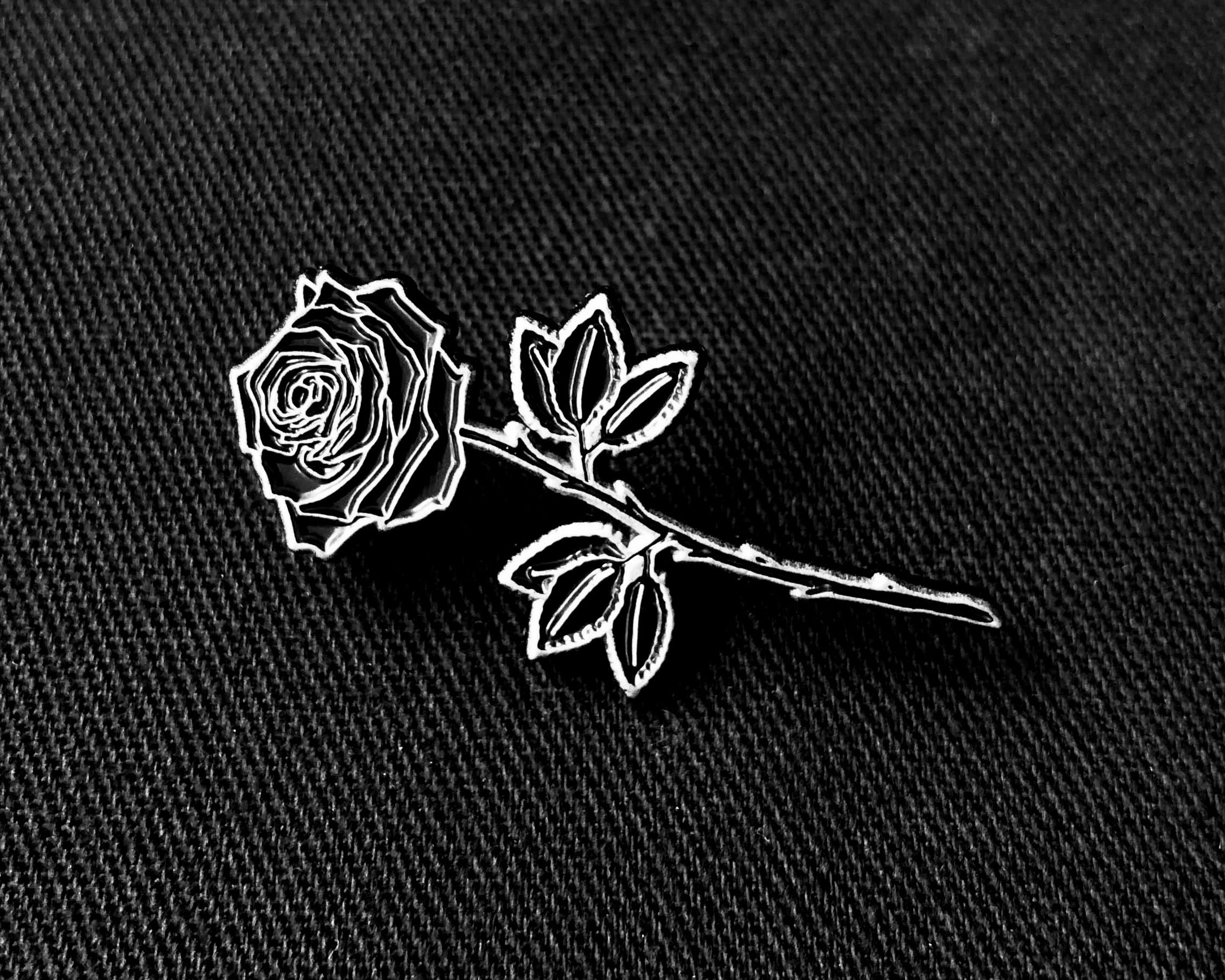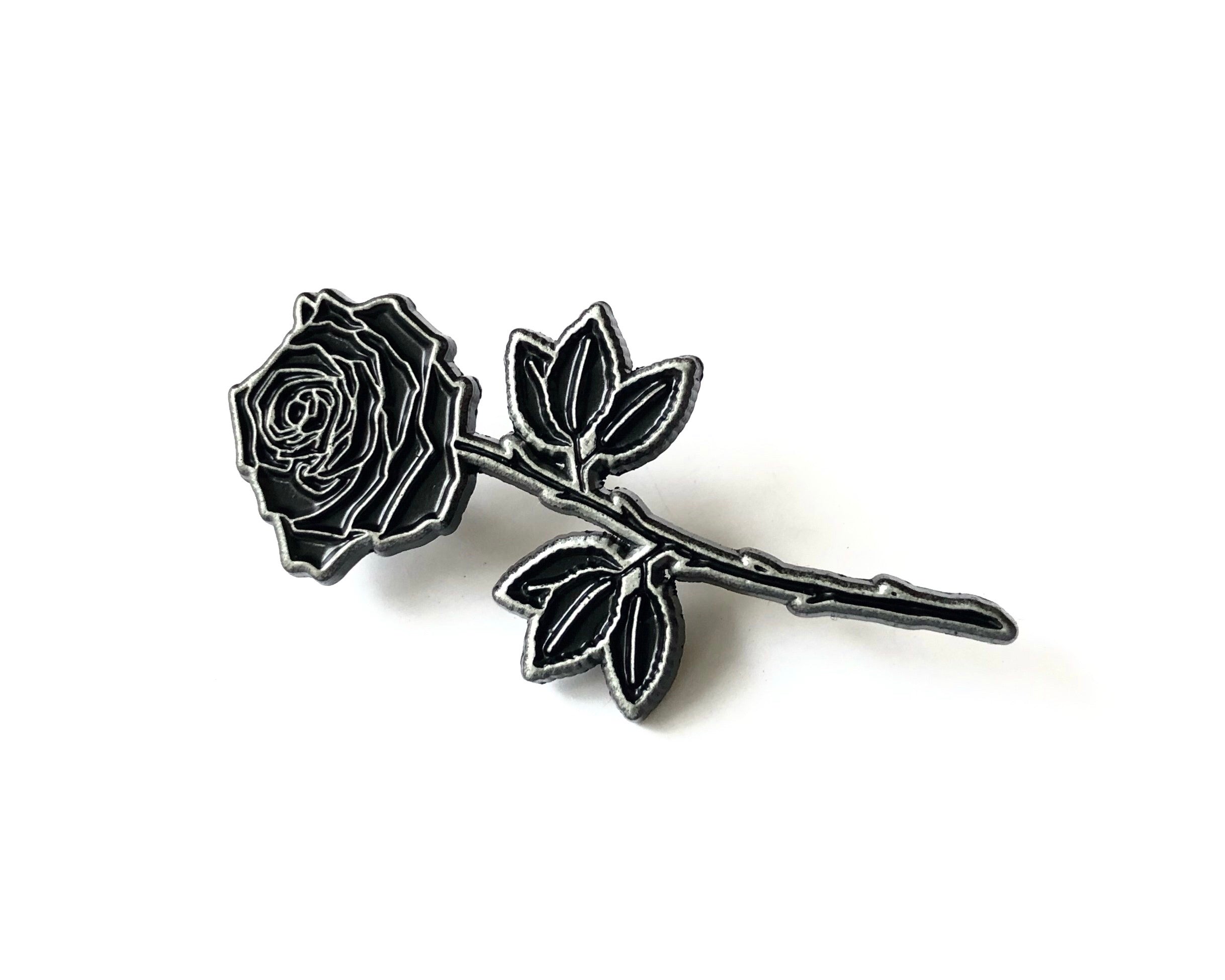 Soft enamel pin with antique silver plating, black enamel, and measuring 1.5” wide.