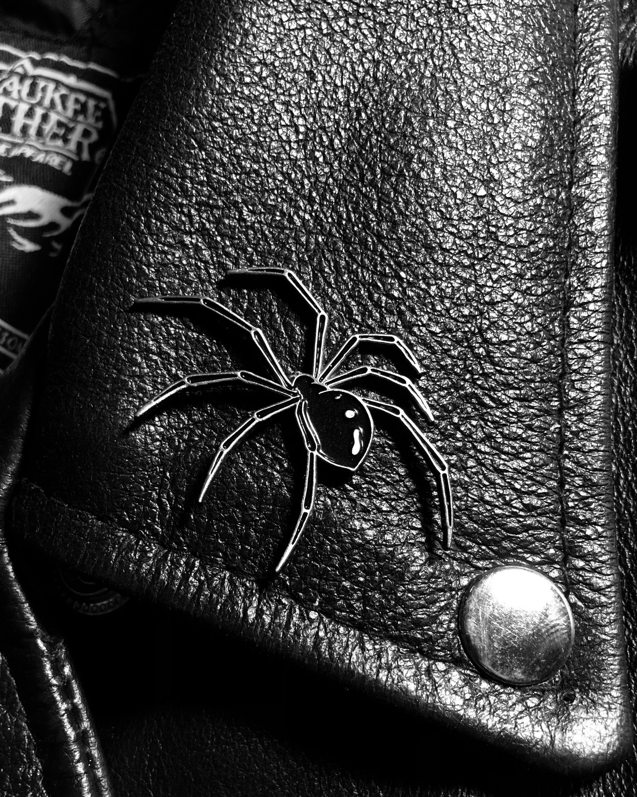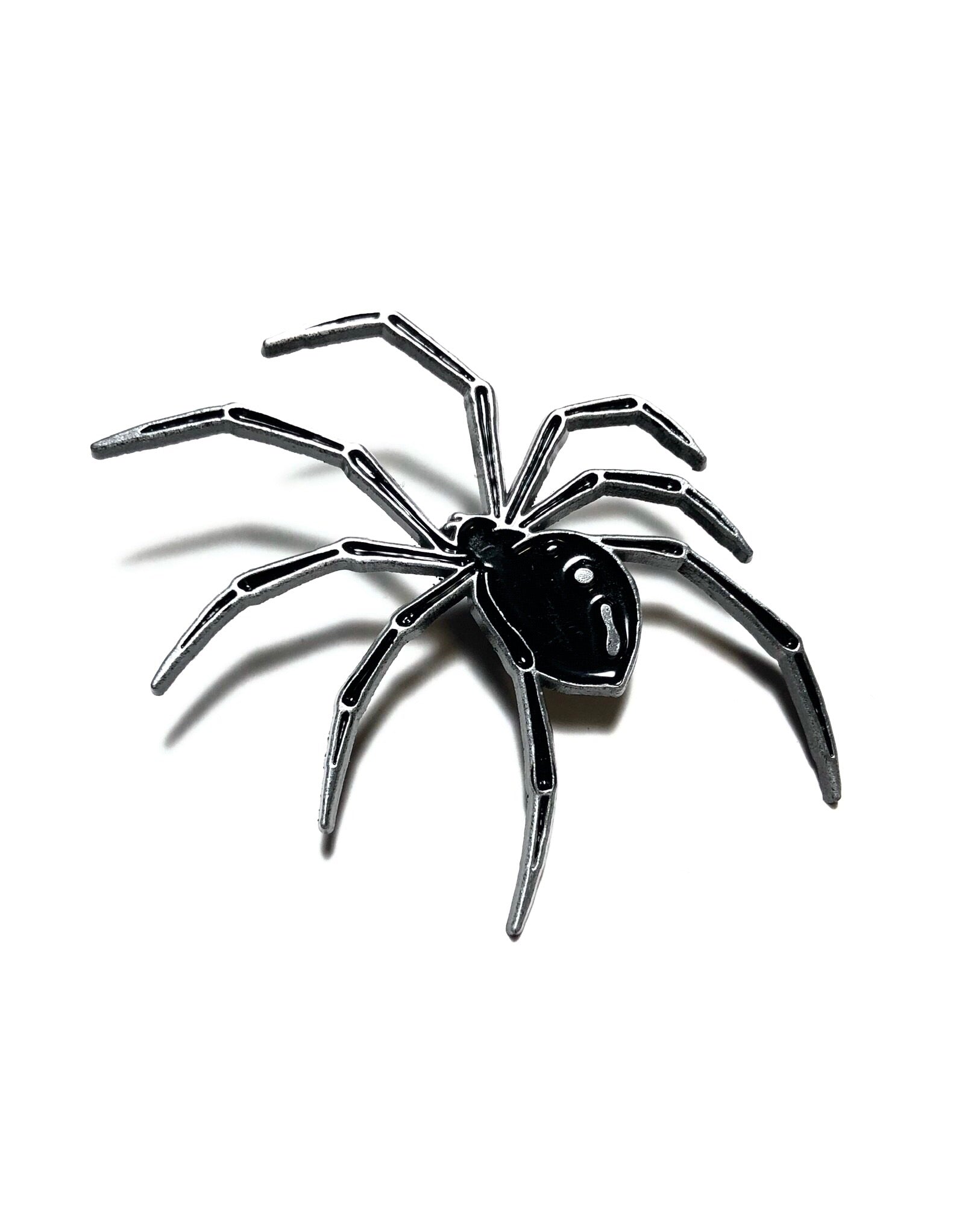 Black Widow soft enamel pin made with antique silver and black enamel, measuring 2 inches wide.