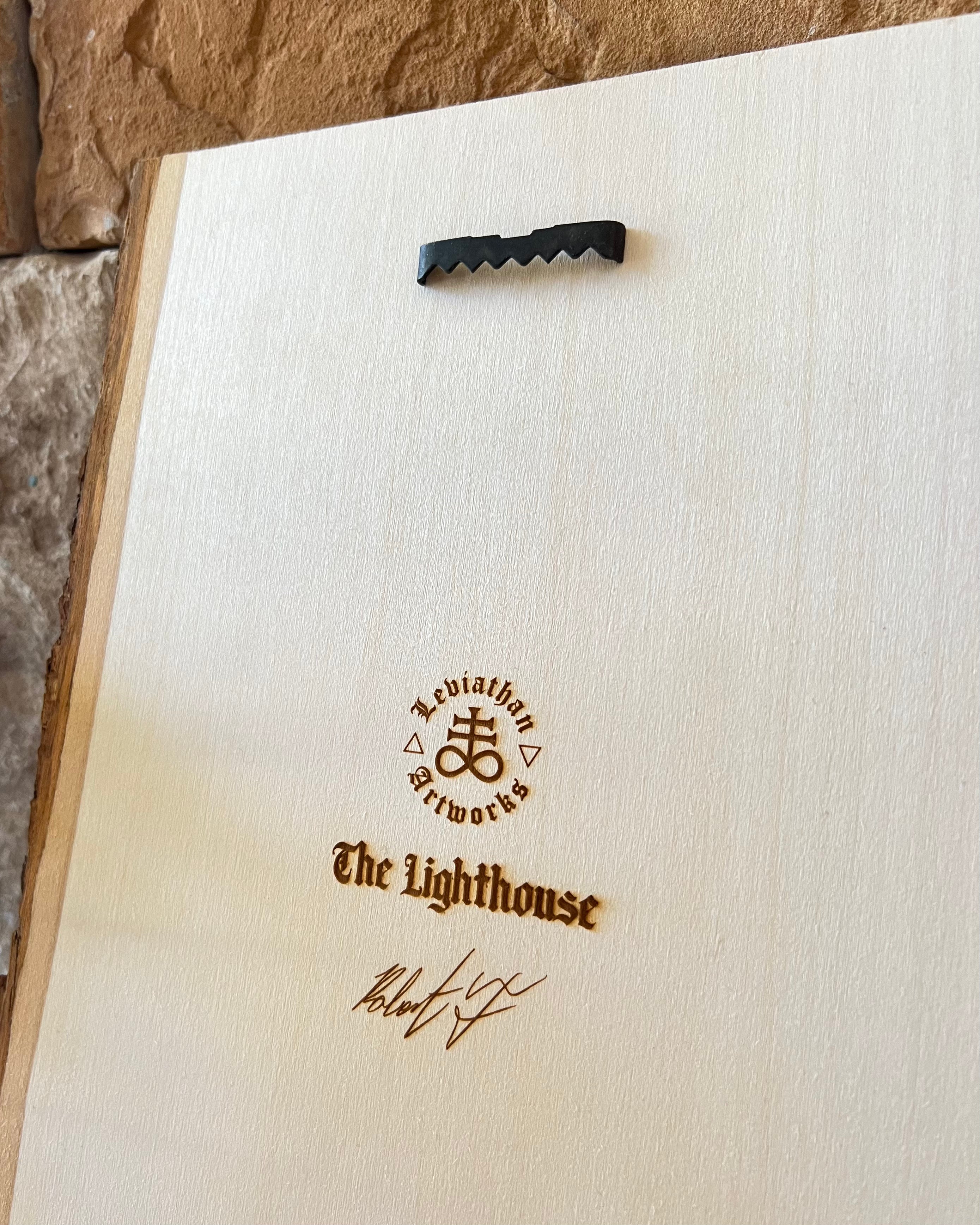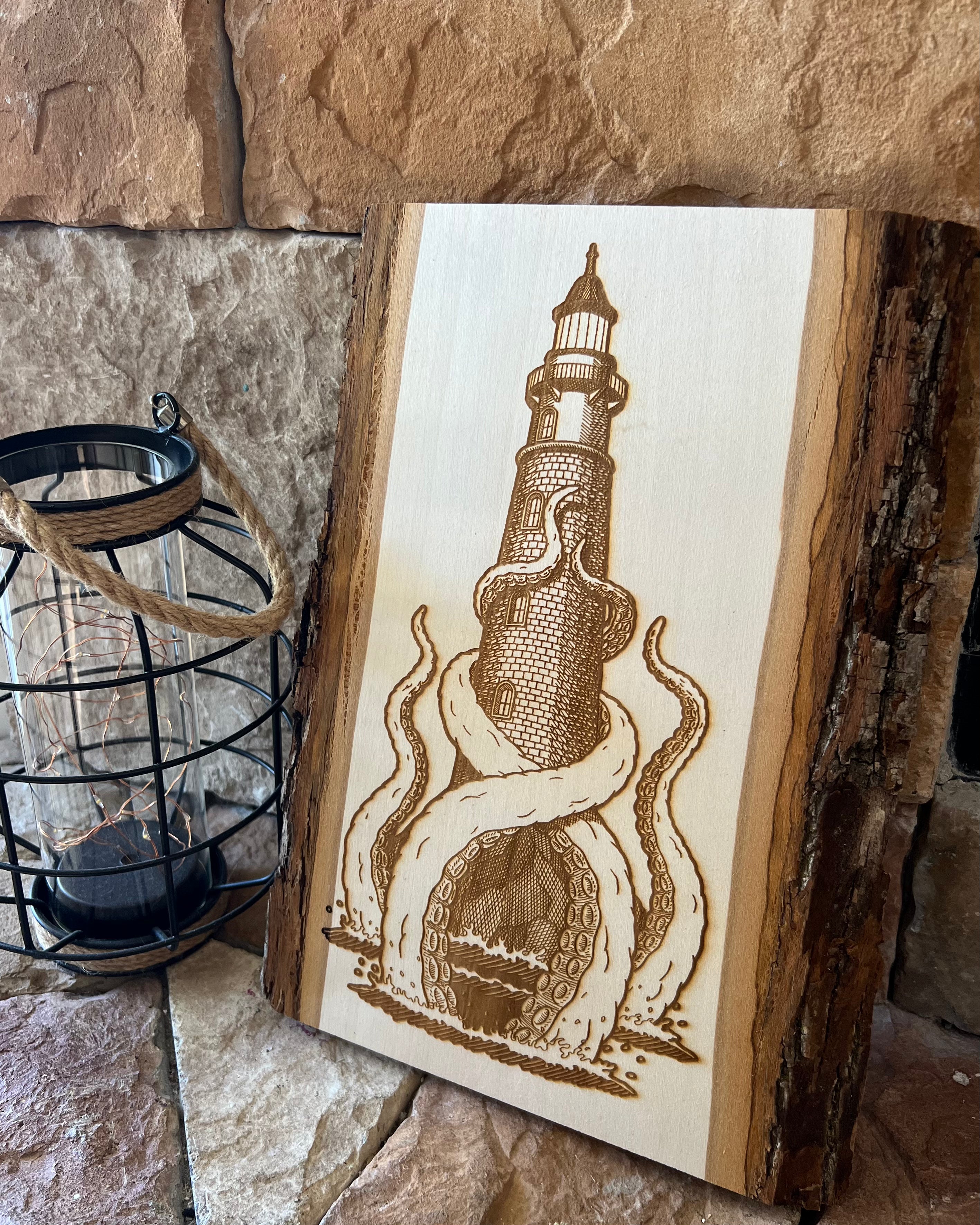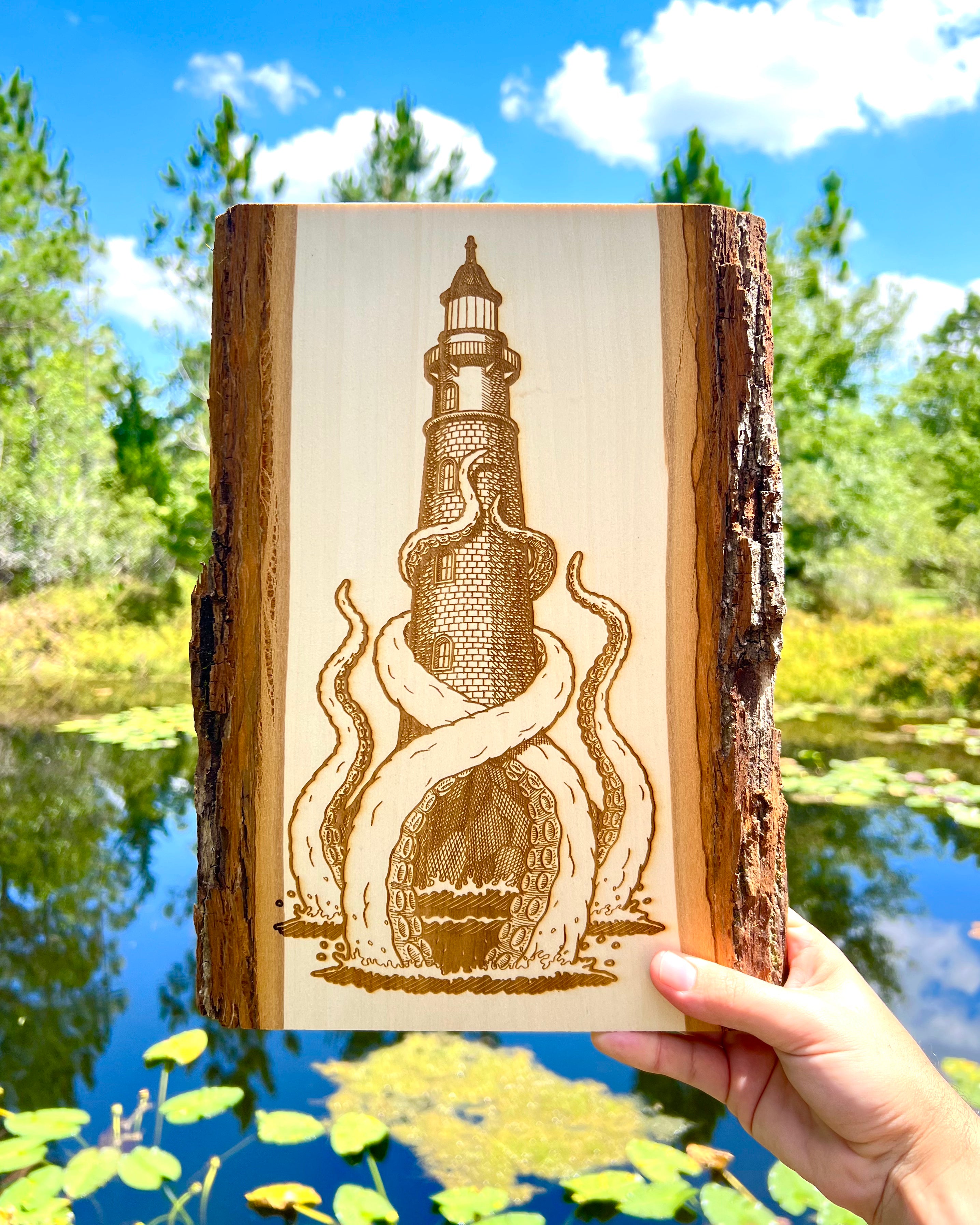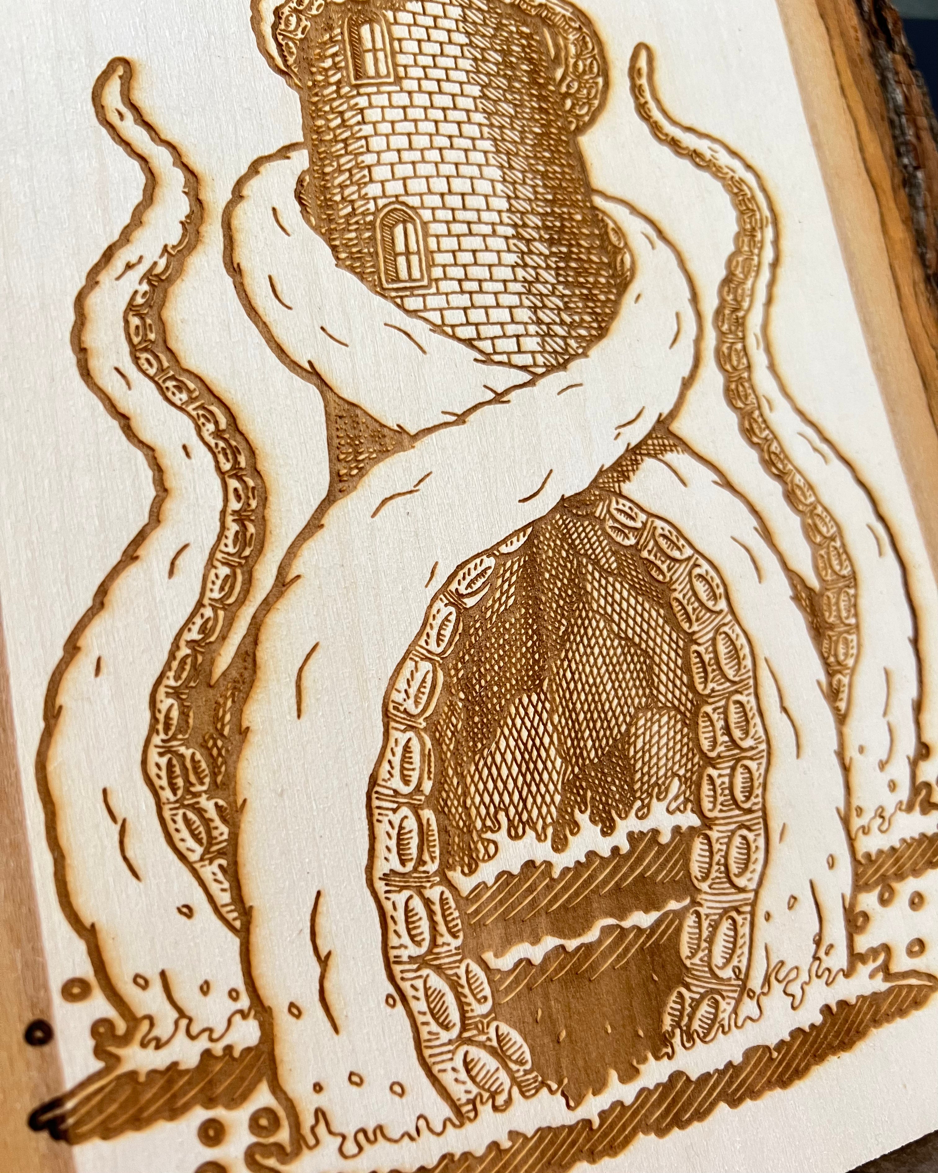 These wood engravings are laser etched onto live edge natural pine boards. The back features engravings of the Leviathan Artworks logo, title of the piece, and my signature.